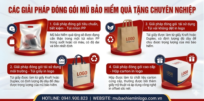 Các giải pháp đóng gói mũ bảo hiểm quà tặng chuyên nghiệp, từ lựa chọn tiêu chuẩn đến cao cấp, không chỉ bảo vệ sản phẩm mà còn là công cụ marketing mạnh mẽ. Bài viết này sẽ phân tích chi tiết 4 phương án đóng gói tại Mũ Bảo Hiểm Quà Tặng gồm túi nilon PP, túi vải không dệt, túi giấy, hộp carton để giúp bạn tìm ra lựa chọn tối ưu nhất.