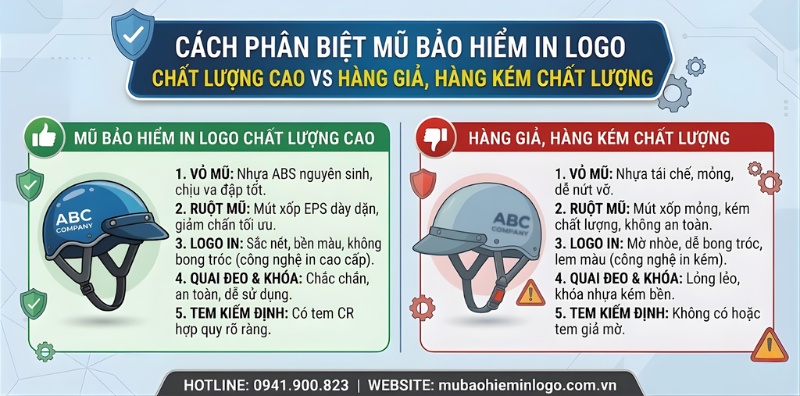 Để phân biệt mũ bảo hiểm in logo chất lượng cao và hàng giả, hãy kiểm tra qua 3 nhóm tiêu chí chính: quan sát trực quan bằng mắt thường các chi tiết như tem, chất lượng sơn và phụ kiện; kiểm tra bằng cảm giác về trọng lượng, độ cứng của vỏ mũ và lõi xốp; và cuối cùng là yêu cầu các giấy tờ chứng nhận hợp quy cần thiết từ nhà cung cấp.