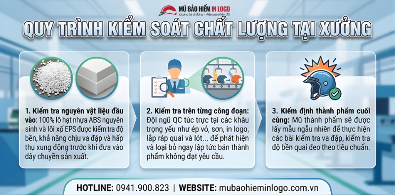 Tốc độ sản xuất luôn đi đôi với cam kết chất lượng, chúng tôi không bao giờ cắt xén công đoạn kiểm tra chất lượng. Điều này đảm bảo doanh nghiệp vừa kịp tiến độ sự kiện, vừa an tâm tuyệt đối về chất lượng mũ bảo hiểm khi đến tay khách hàng.